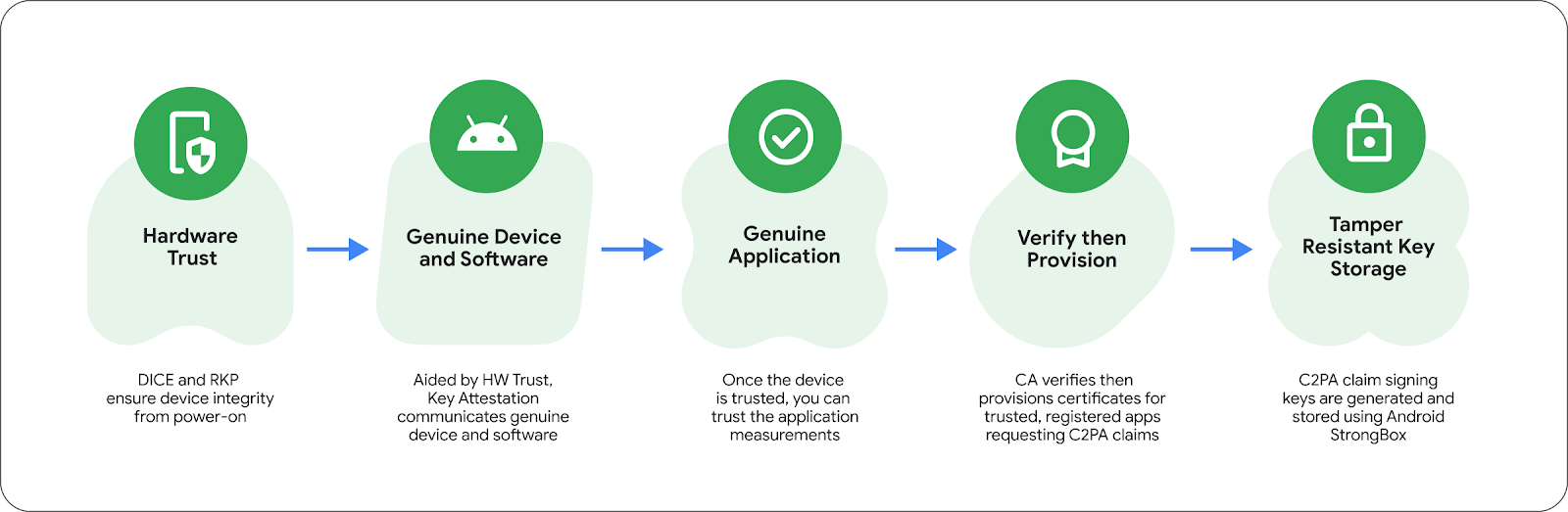 - Genuine Device and Software: Aided by the hardware trust described above, Android Key Attestation allows Google C2PA Certification Authorities (CAs) to verify that they are communicating with a genuine physical device. It also allows them to verify the device has booted securely into a Play Protect Certified version of Android, and verify how recently the operating system, bootloader, and system software and firmware were patched for security vulnerabilities.
